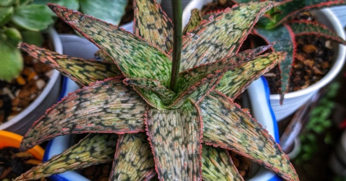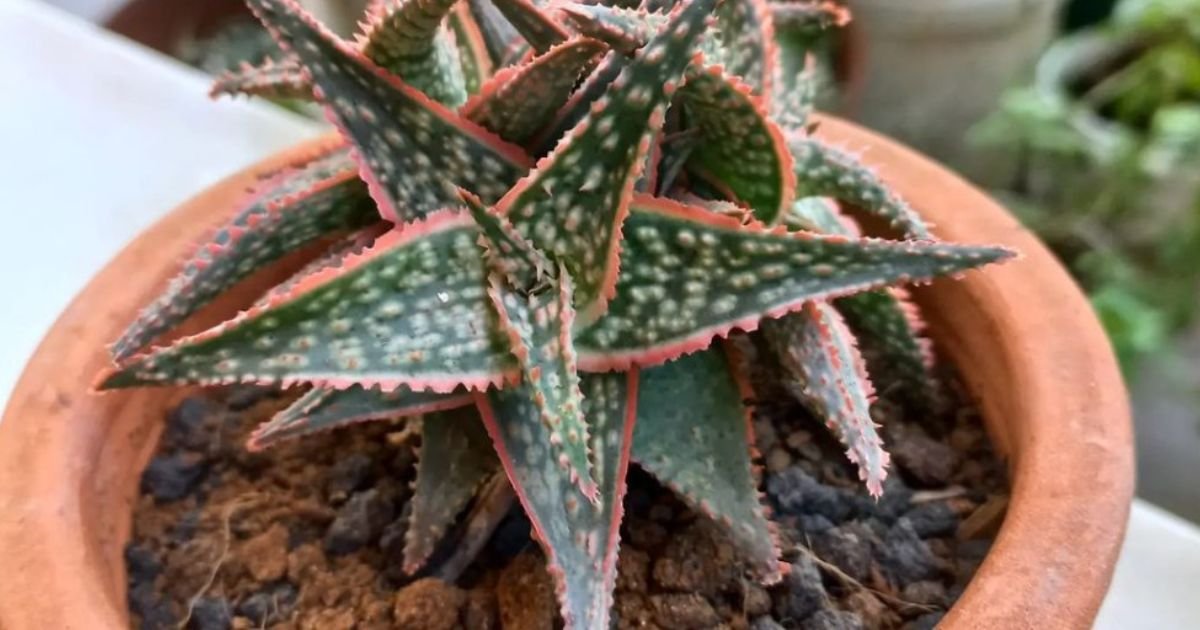 Aloe Bright Star resembles a starfish as its succulent leaves form a round shape. It is a hybrid form of Aloe. The leaves have some whitish-dotted spots with pinkish-red bordering. The prime reason for it to bloom is summer and fall.
