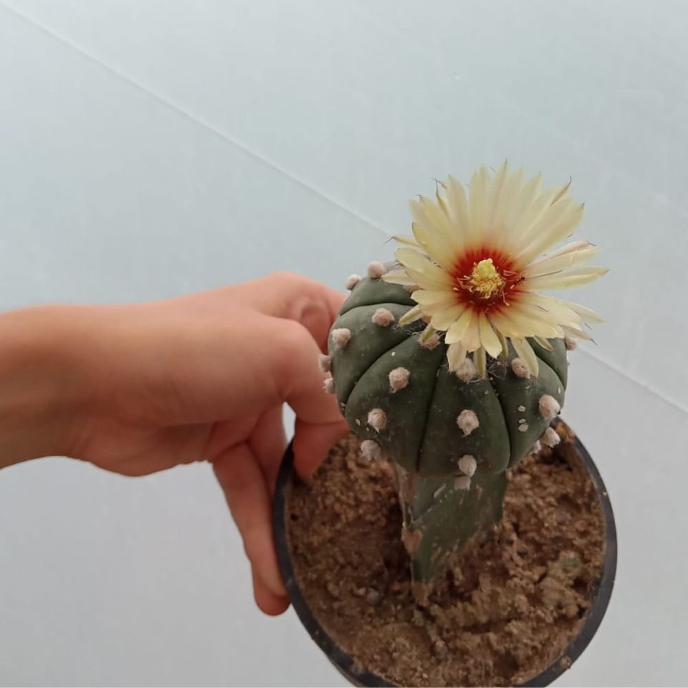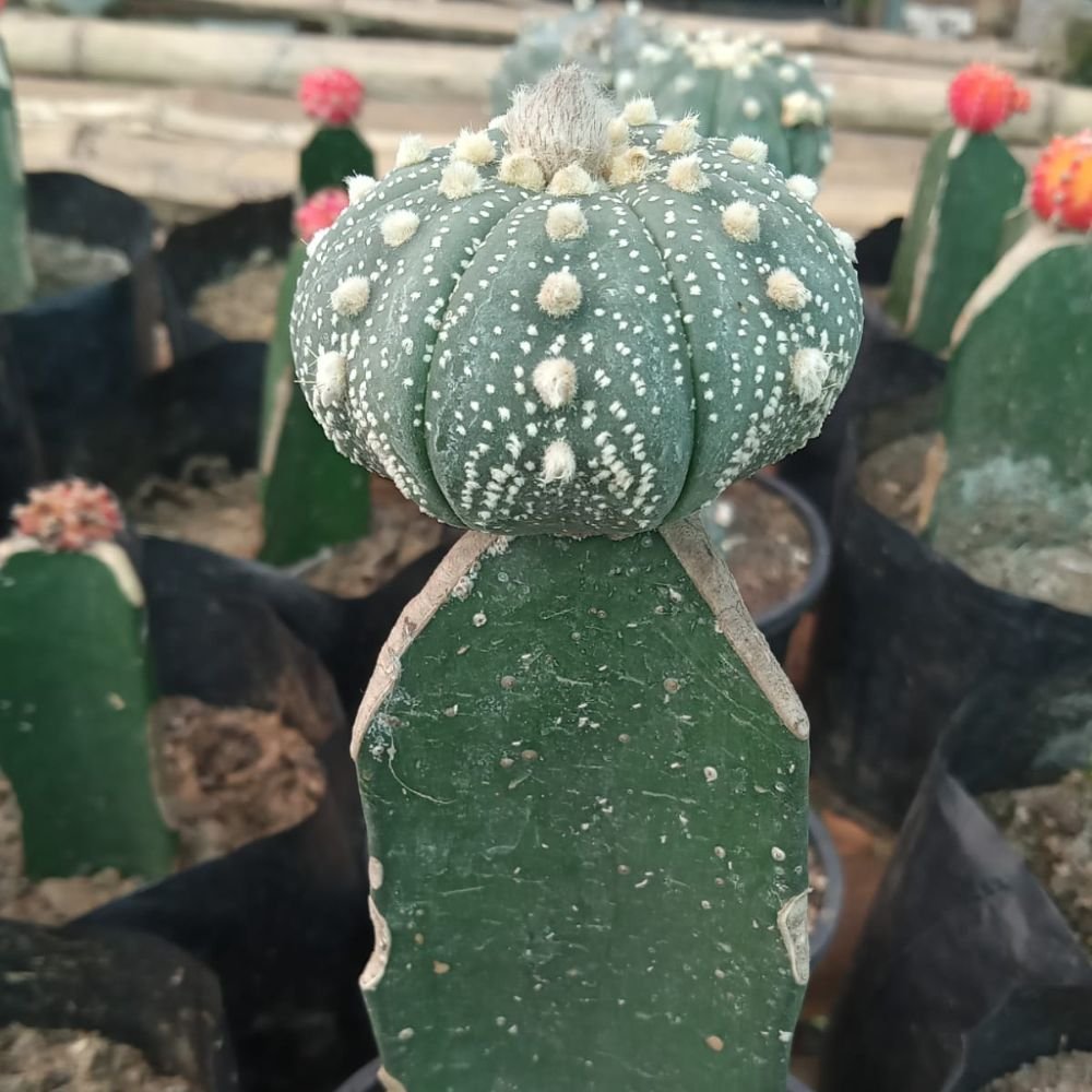 The Astrophytum Grafted Cactus is a type of cactus that can thrive in high temperatures. During the summer, it produces strikingly beautiful large yellow blooms with a reddish center, shaped like funnels. The stem of this cactus is round and the spines can vary in appearance from one piece to another. The body of the cactus is circular and divided, with a green color that is decorated by white hair tufts. Astrophytum Grafted Cactus is in high demand for its ability to thrive in dry and hot conditions.