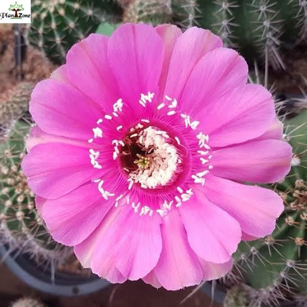 Originating from South America, the Echenopsis cactus is a small and dense plant, renowned for its unique, circular form and sharp spines. It boasts a green exterior with distinct white spots, arranged in a patterned manner. Moreover, the Echenopsis cactus exhibits a stunning range of colorful flowers, depending on the specific species, which can further enhance the plant’s appeal. These vibrant blossoms can be observed blossoming from the top of the cactus, complementing the lush greenery of the plant.