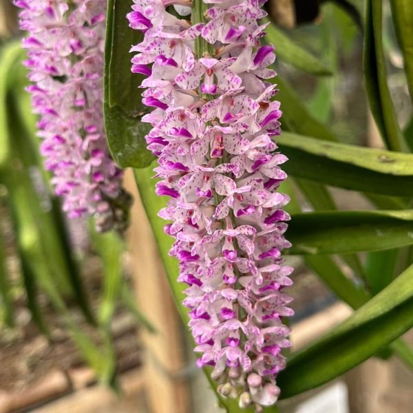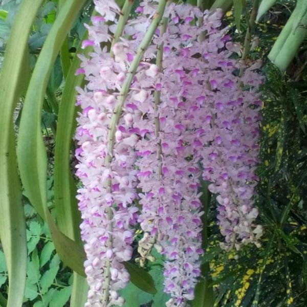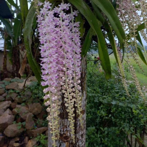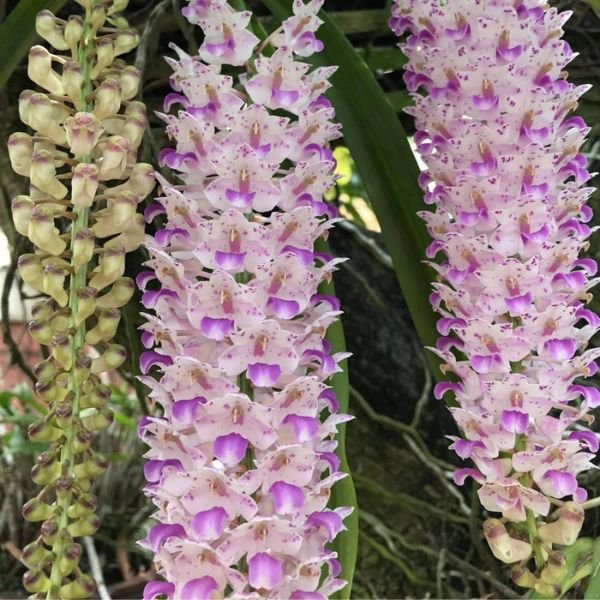 The Foxtail Orchid produces elongated flower spikes that resemble a foxtail, hence its name. Each spike carries numerous small, bell-shaped flowers in shades of white and pink with purple speckles. These blooms form a tightly packed cluster, creating a stunning visual display. The leaves are strap-shaped, leathery, and grow in pairs, complementing the elegance of the blooms.
