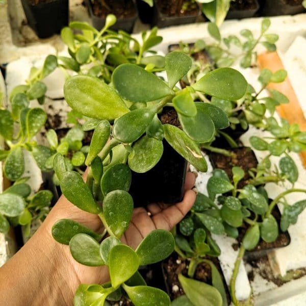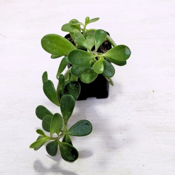 The Hanging Crassula features trailing stems adorned with thick, oval-shaped leaves. The leaves are usually a lush green, with some varieties having hints of red or purple along the edges. Its cascading growth pattern makes it ideal for creating a lush, flowing effect in hanging planters. When cared for properly, it may produce tiny, star-shaped flowers that add a delicate touch to its beauty.