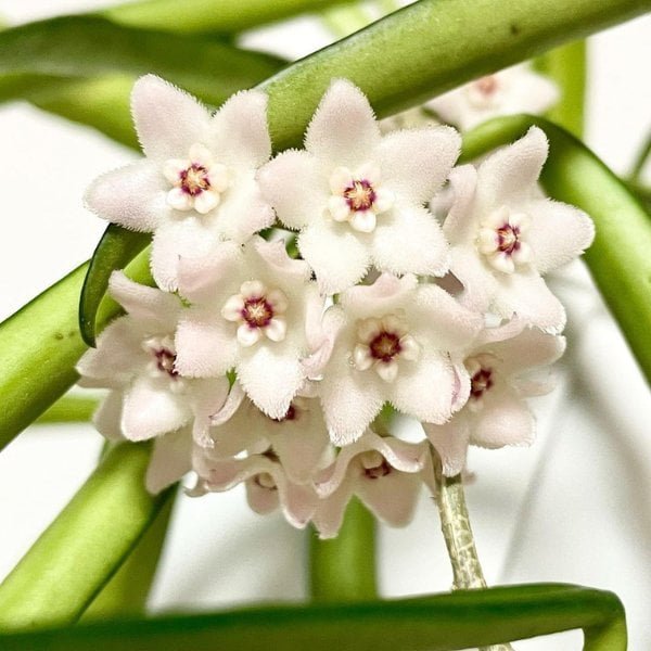The Hoya Shepherdii, also known as the “String Bean Hoya,” features slender, green leaves that resemble beans. It produces clusters of fragrant white flowers with a pink center. This easy-to-care-for plant thrives in bright, indirect light and makes a lovely hanging plant.