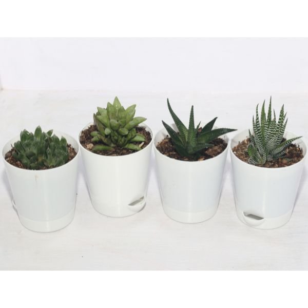Bring a little piece of nature into your office with our Plants Collection for your work desk. These four white self-watering pots with succulents are a great way to add a touch of green to your workspace while keeping things simple and stylish. Elevate your desk decor and create a more inviting atmosphere with these beautiful and easy-to-care-for plants.