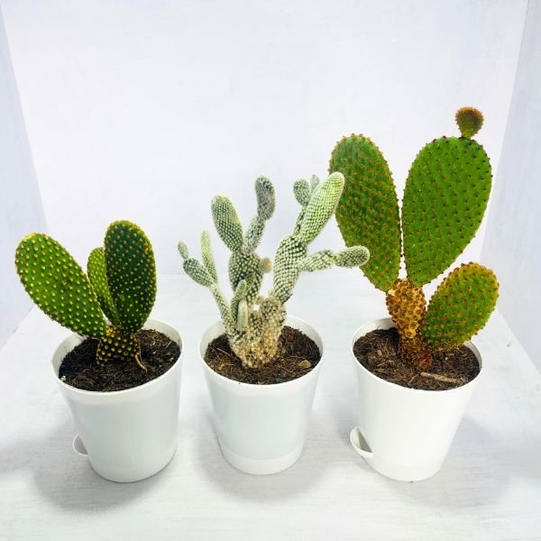 Bring a touch of the desert to your home with our Prickly Pear Cactus Collection! This set features three fun and colorful cacti: the Red Bunny Ear Cactus, White Bunny Ear Cactus, and Yellow Bunny Ear Cactus. Each one has its own unique look and charm, making them perfect for brightening up any room.