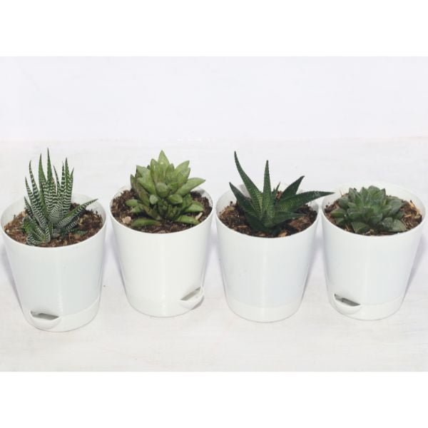 These low-maintenance succulents are ideal for those with a busy schedule, as they require minimal care and attention. Simply place them in a well-lit area and water sparingly. The sleek white self-watering pots complement any decor style and add a modern touch to your workspace.